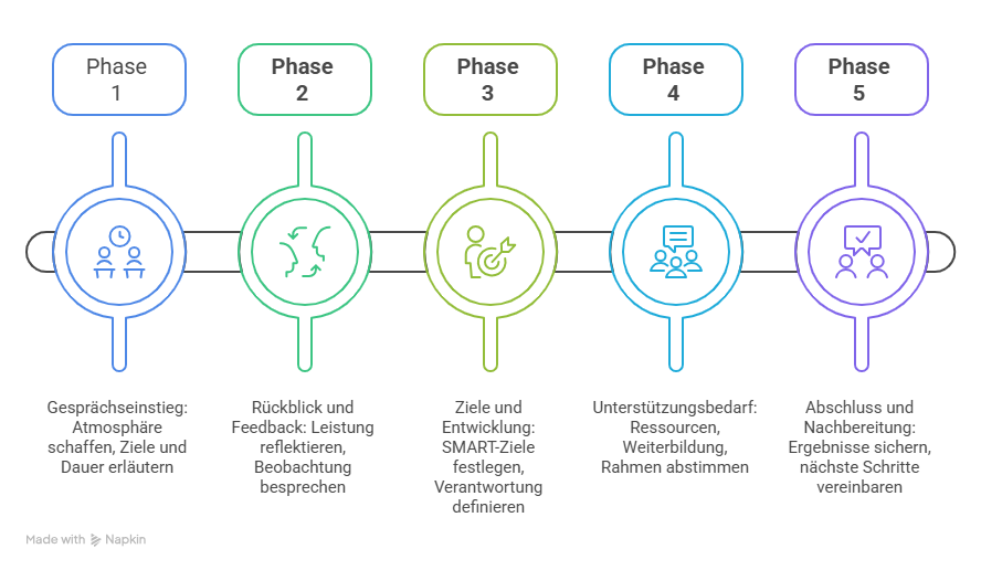 Ein Mitarbeitergespräch kann nach einem klaren Schema aufgebaut werden, das Offenheit, Verbindlichkeit und Klarheit unterstützt. Die folgenden fünf Phasen sind ein praxisnahes Modell, das sich in vielen Gesprächen bewährt hat. Werden Zielvereinbarungen ausgelassen, fehlt häufig eine wichtige Grundlage für Verbindlichkeit und Nachverfolgung.