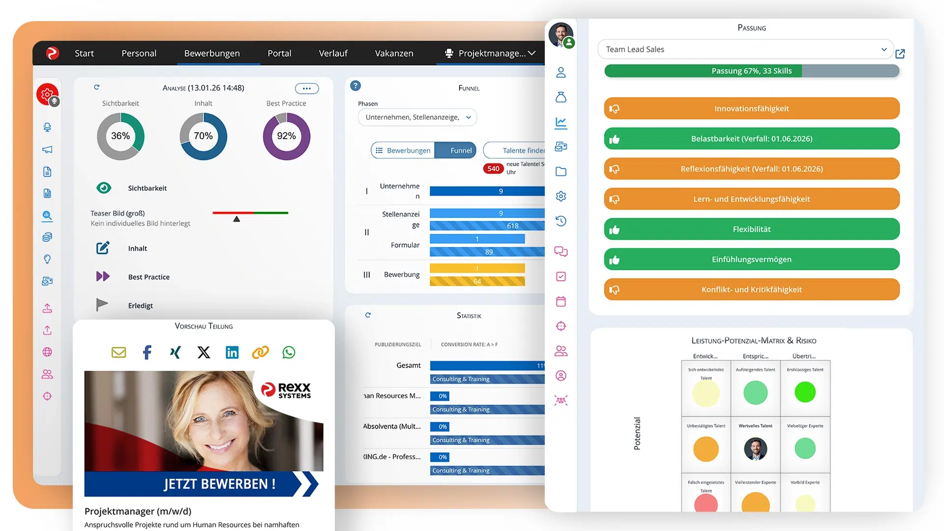 Rexx liefert interaktive Dashboards, Ad-hoc-Reports und Predictive-Analytics-Modelle für Kennzahlen wie Fluktuation, Skill-Lücken oder Abwesenheitsmuster. Mit dem integrierten HR Data Warehouse lassen sich komplexe Auswertungen erstellen und personalstrategische Maßnahmen besser planen.